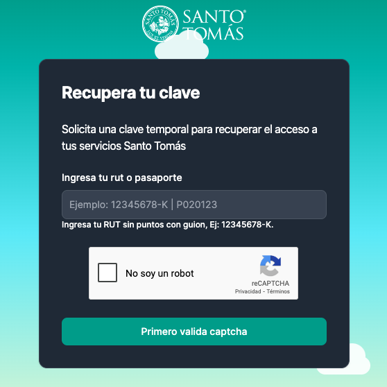 Si tienes problemas para acceder, puedes recuperar tu clave ingresando a https://recuperatuclave.santotomas.cl/login y siguiendo estos pasos: