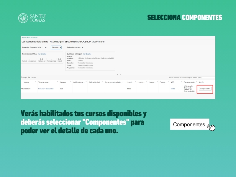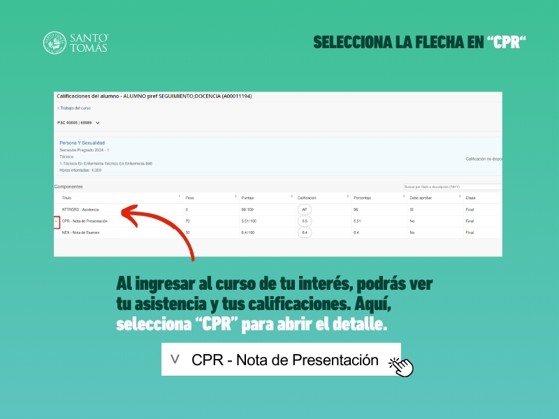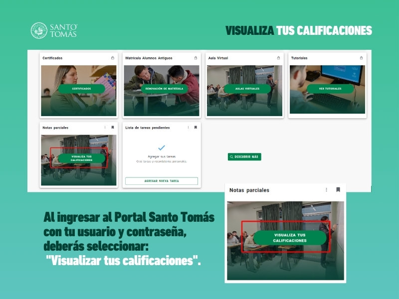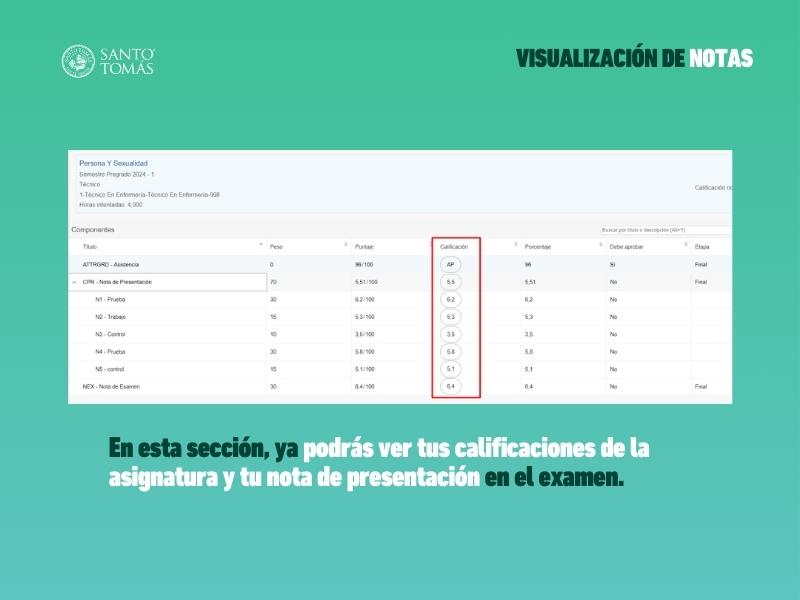 Para facilitar el acceso a tu información, creamos una tarjeta denominada “Visualiza tus Calificaciones”, que te llevará directamente a las asignaturas para revisar las notas parciales/finales, además de tu asistencia final.